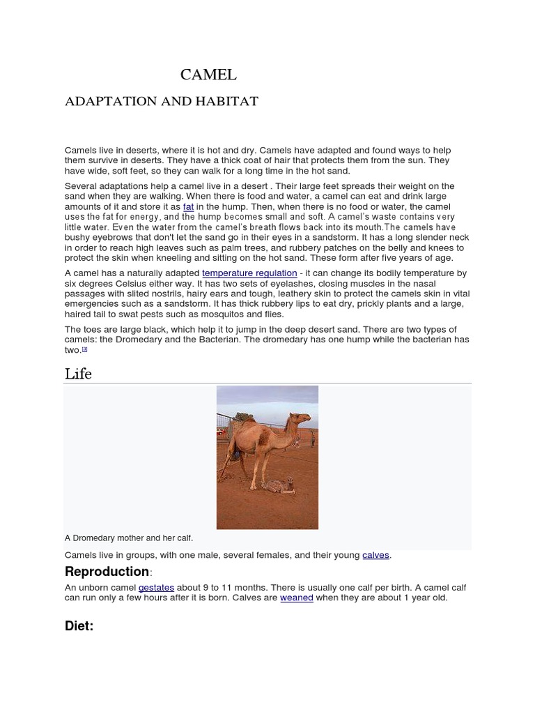 Adaptations are special characteristics that an organism is born with and which enable it to survive in its natural habitat. It also has passed fret which helps it to walk on the hot sand. In this way the body catches less sun and doesn't heat up at fast. The long eyelashes keep sand out of the camel's eyes. Why does a camel have nostrils which can close? Current technologies and present reproduction approaches in camel reproduction. The following adaptations show that the camel is specially suited to live in the desert. Camels urinate on their legs to try and cool down the blood. adapted to the rigors of the extreme diurnal variations of temperature of the arid zones of africa and. The male reproductive system includes the penis, scrotum, testes, epididymis, vas deferens, prostate, and seminal vesicles. These include the animal's eyelashes. It acts as a water reservoir. Camel is an important component camel is an important component of the desert ecosystem from time immemorial and is this will be helpful for antibody production against cpspb and sensitive ria or elisa systems development.